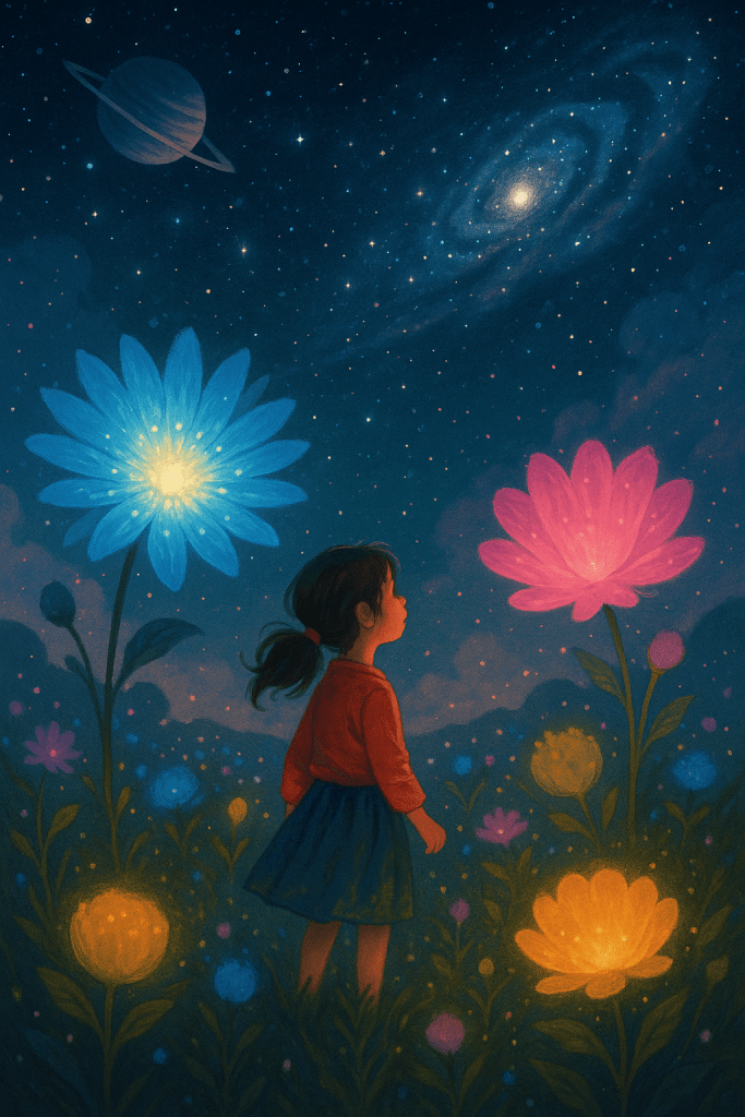 But then she noticed something magical. The flowers that bloomed quickly often faded just as fast – like a sparkler, bright but gone in seconds. The slower ones, however, when they finally decided to open, were breathtaking. Their glow was steady, gentle, and long-lasting, like a cozy lamp in a dark room. And the traveler realized: “Maybe waiting isn’t so bad. Maybe slow blooms shine the brightest.”