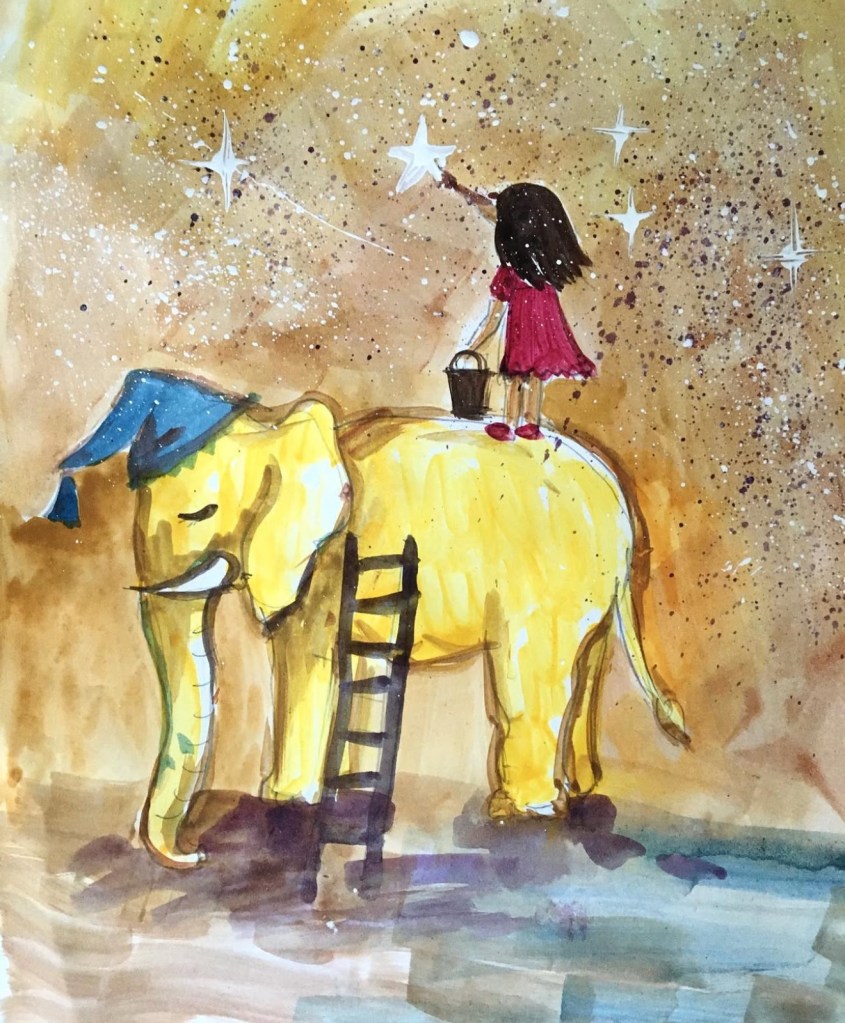 Happiness is found in silly little dreams – like painting stars from the back of a friendly elephant.